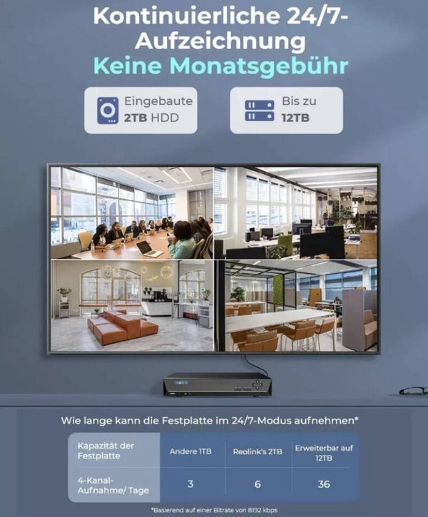 Einfach zu montierendes PoE NVR-System: Die Installation kostet weniger Zeit. Über ein Ethernet-Kabel ist jede Kamera mit dem NVR zu verbinden, um die Strom- und Datenübertragung zu schaffen. Der NVR bietet massiven Speicherplatz von bis zu 12TB